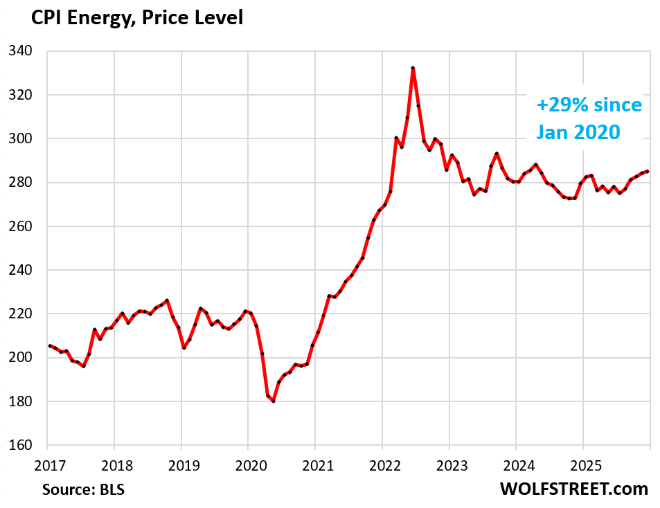 Inflation is the rate of change of prices. And the rate of change of energy prices has cooled, due to the drop in gasoline prices. In December, the energy CPI was up by 2% from a year ago. But it remains high, up by 29% from January 2020.