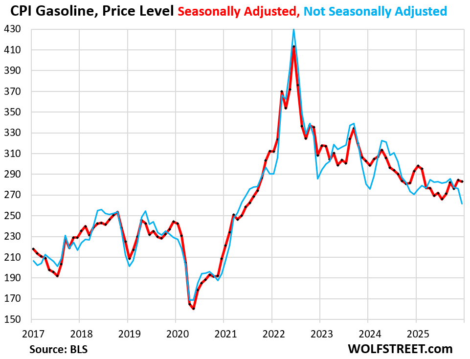 The CPI for gasoline reflects the national average. In December, on a not-seasonally adjusted basis, it dropped to the lowest since April 2021, and was down 3.4% year-over-year (blue line).