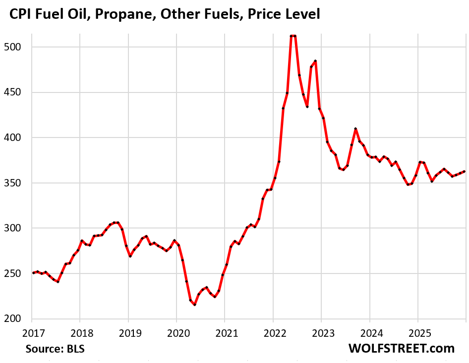 The CPI for “Other fuels” (fuel oil, propane, kerosene, firewood, etc.) had spiked by 63% from January 2020 through mid-2022, and then gave up a portion of that spike. It remains 29% higher than in January 2020. Year-over-year, the index is up 1.2%: