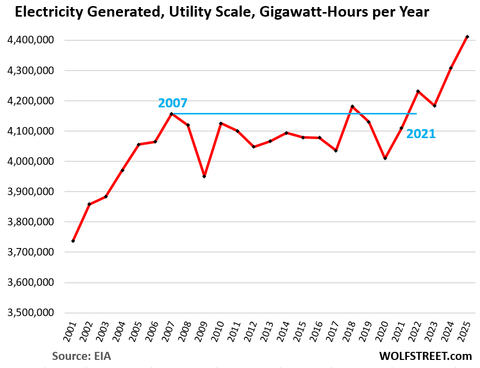 But that surge in demand is only a recent factor, largely in 2024 and 2025; that’s when the quantity of electricity generated began to surge, after spending 15 years in stagnation.