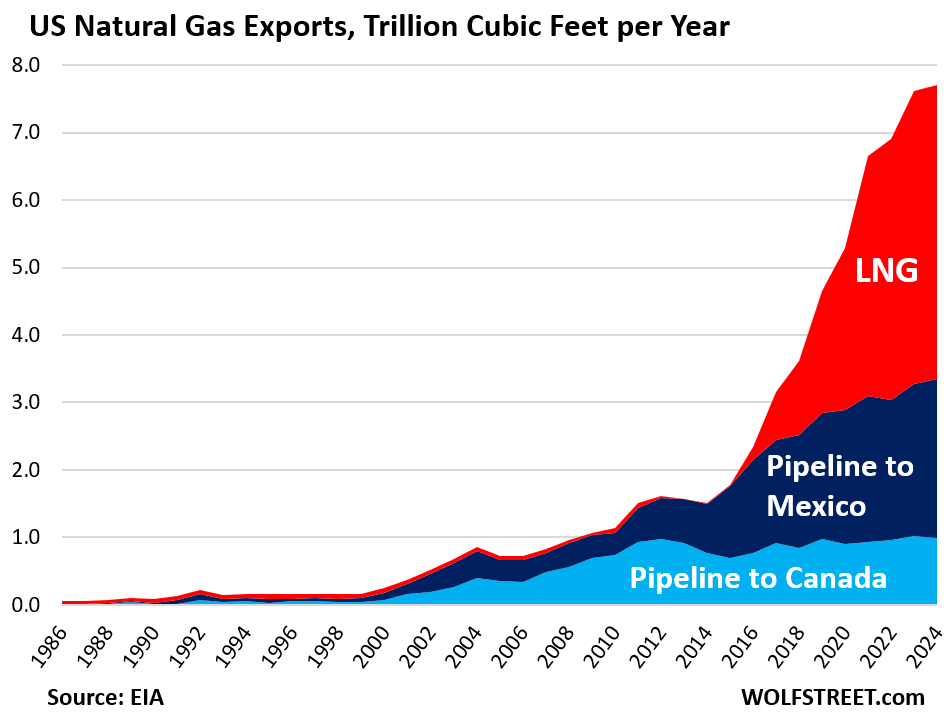 Exports via pipeline and since 2016 via LNG have created lots of new demand. The US has become the largest LNG exporter in the world, and new export terminals have been coming on line every year. The US also exports large and growing quantities of natural gas to Mexico via pipeline. It also has a bilateral natural gas trade with Canada, importing more from Canada than exporting to Canada as some regions in both countries are not well connected via pipelines to their producing regions, such as New England, which gets most of its natural gas from Canada.