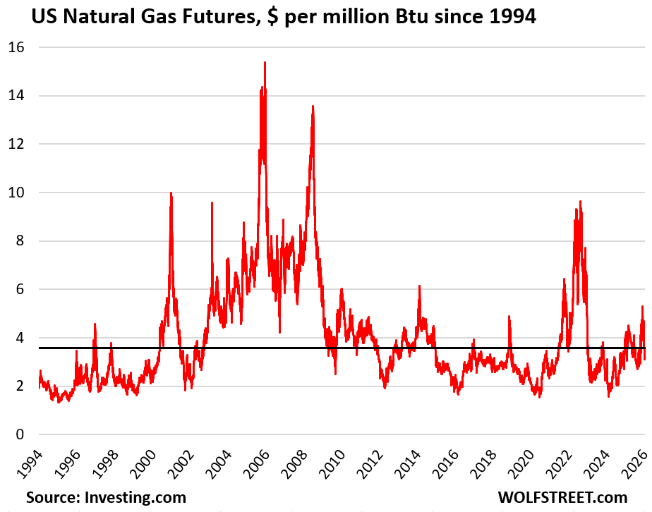 The price has recently fallen back into that range (currently $3.57 per million Btu). But that’s not the price that households pay their utilities.