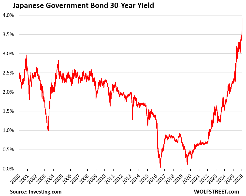 The 30-year yield of Japanese Government Bonds (JGBs) exploded by 30 basis points today and by 42 basis points over the past two days, to 3.91%, the highest since the 30-year bond was introduced in 1999, after Prime Minister Sanae Takaichi called for increased government spending with simultaneous tax cuts by pausing the 8% consumption tax on food purchases. And she announced snap elections — three months after taking office — to get the public support her party needs to push those plans through parliament.