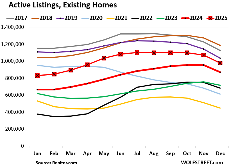 The metric of pending sales tracks contracts that were signed in December but that haven’t closed yet and could still get canceled because buyers cannot afford homeowner’s insurance, or cannot sell their own home, or for other reasons. The rate of cancellations has been running high in 2025.