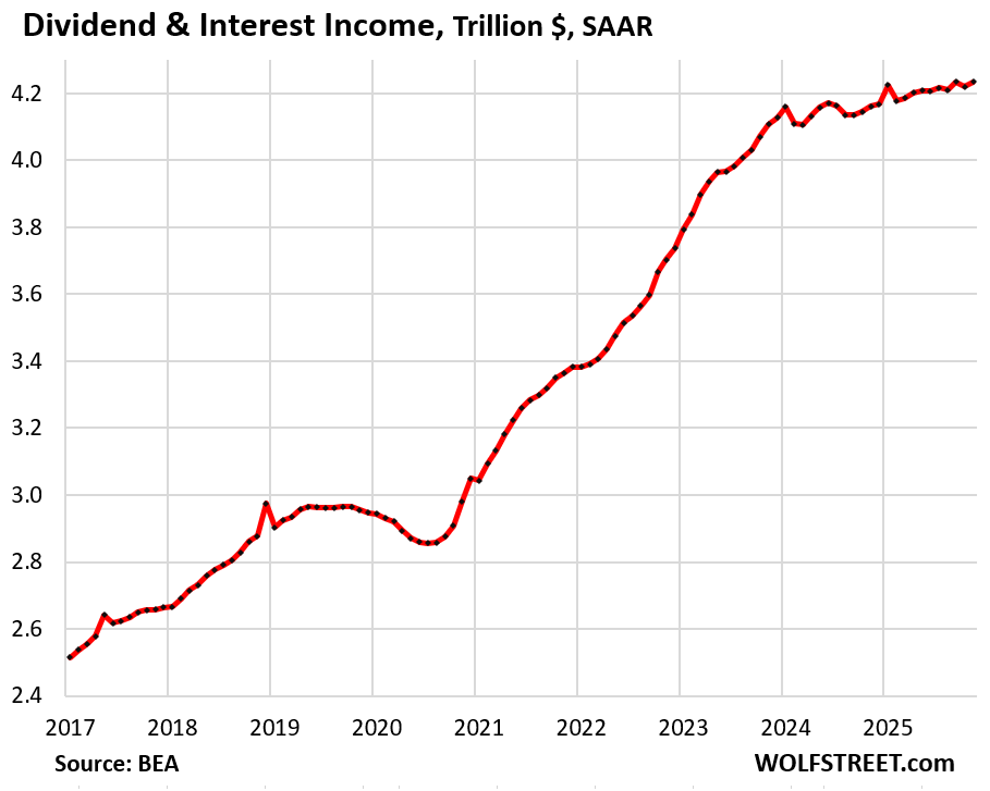 Dividend and interest income rose by 1.7% year-over-year to an annual rate of $4.23 trillion.
