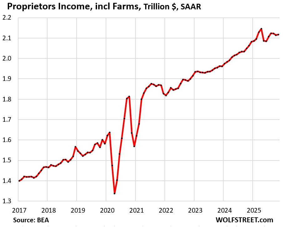 Proprietors’ income from personally owned small businesses and farms rose by 2.6% year-over-year to an annual rate of $2.12 trillion, nearly all of it from businesses ($2.05 trillion annual rate), and very little from farms ($68 billion annual rate).
