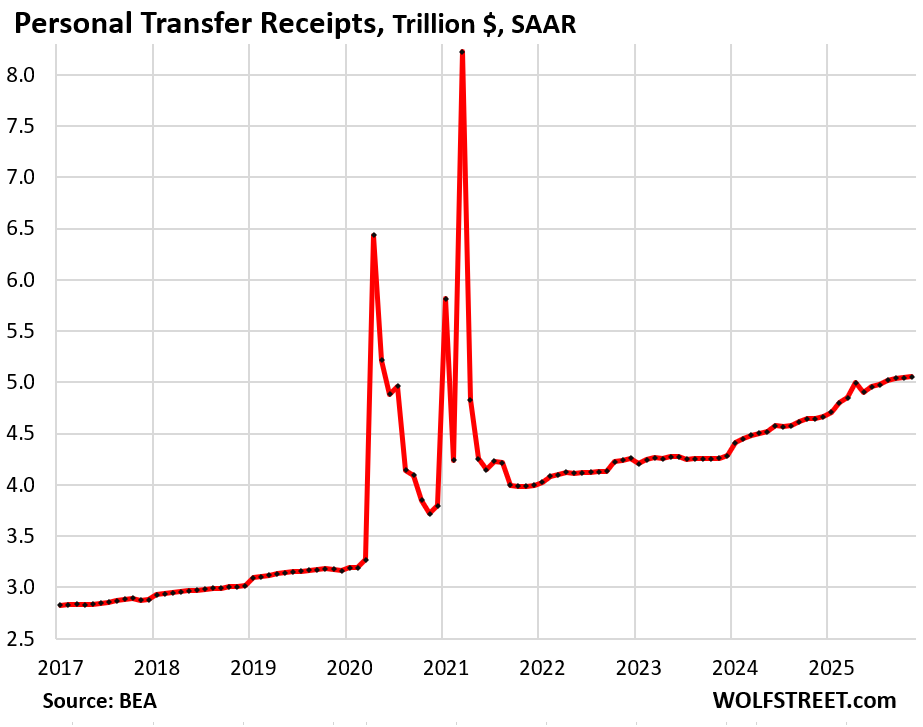Personal transfer receipts rose by 8.8% year-over-year to an annualized rate of $5.06 trillion. This includes Social Security benefits paid to retirees, Medicare and Medicaid benefits paid to healthcare providers, unemployment insurance, VA benefits, etc.