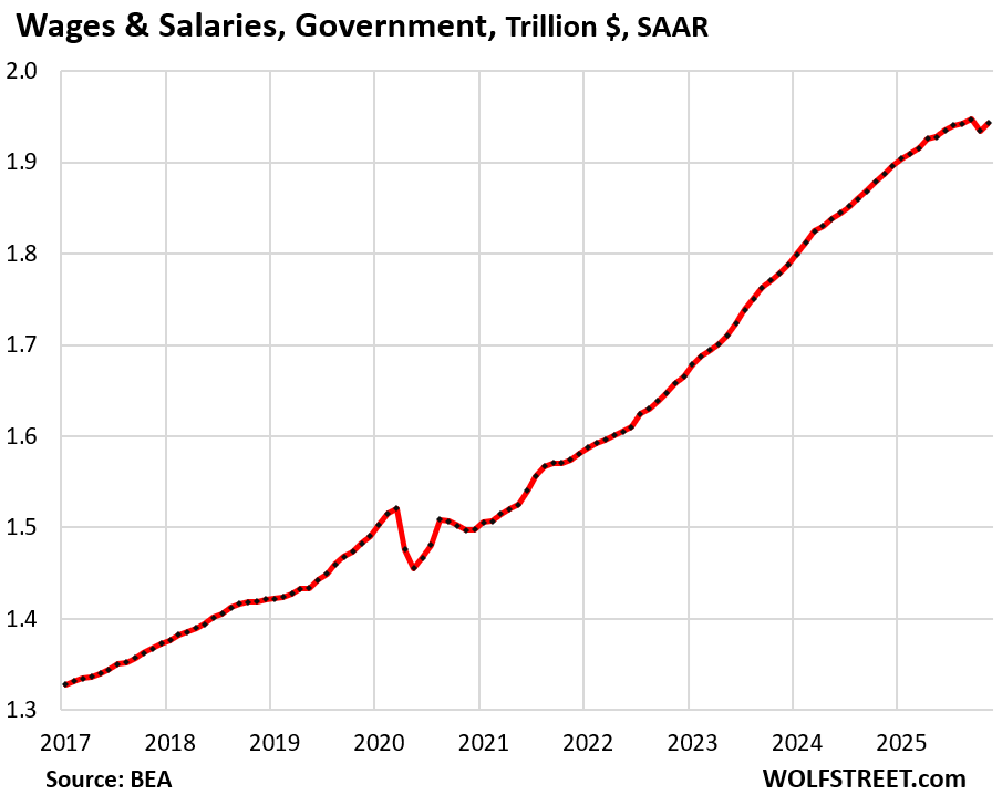 In October, there was a drop in income as employment at the federal government plunged by 179,000 jobs, largely the result of workers who’d volunteered to exit earlier in 2025 but who, as part of their severance package, had continued to receive salaries through September 30.