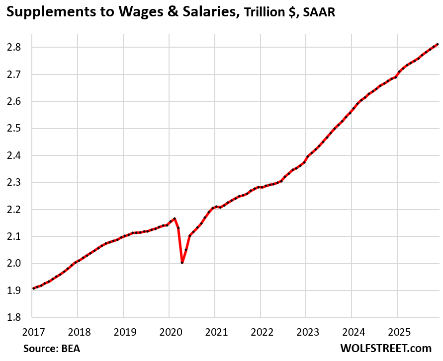 Supplements to wages & salaries rose by 4.8% to an annual rate of $2.8 trillion in November. These are the amounts employers paid for their employees in two categories: