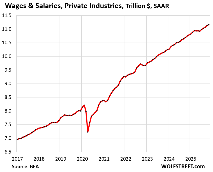 Wages & salaries in private-sector industries rose by 3.9% year-over-year to an annual rate of $11.2 trillion, according to data from the Bureau of Economic Analysis.