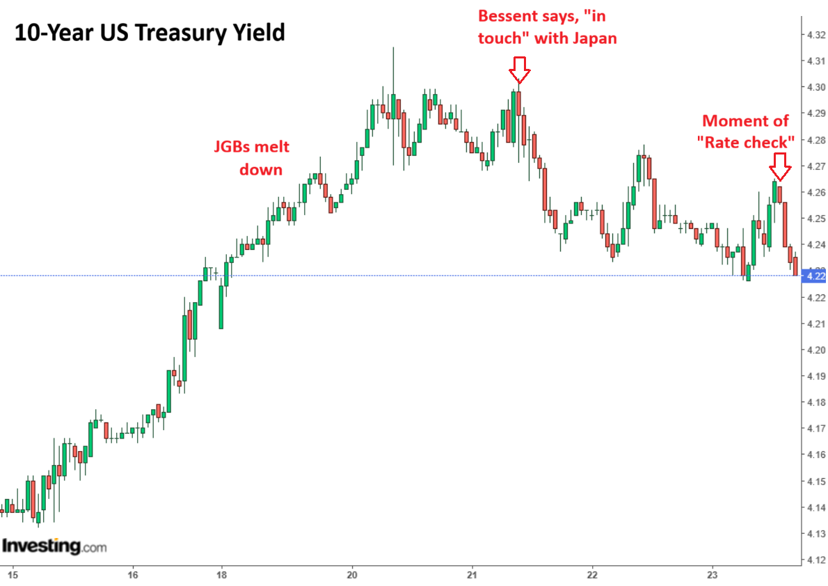 With this two-step three-day jawboning — first on Wednesday when Bessent said he “got in touch” with Japanese authorities, and then on Friday, with the “rate check” — the 10-year yield dropped from 4.30% to 4.23% (hourly chart via Investing.com).