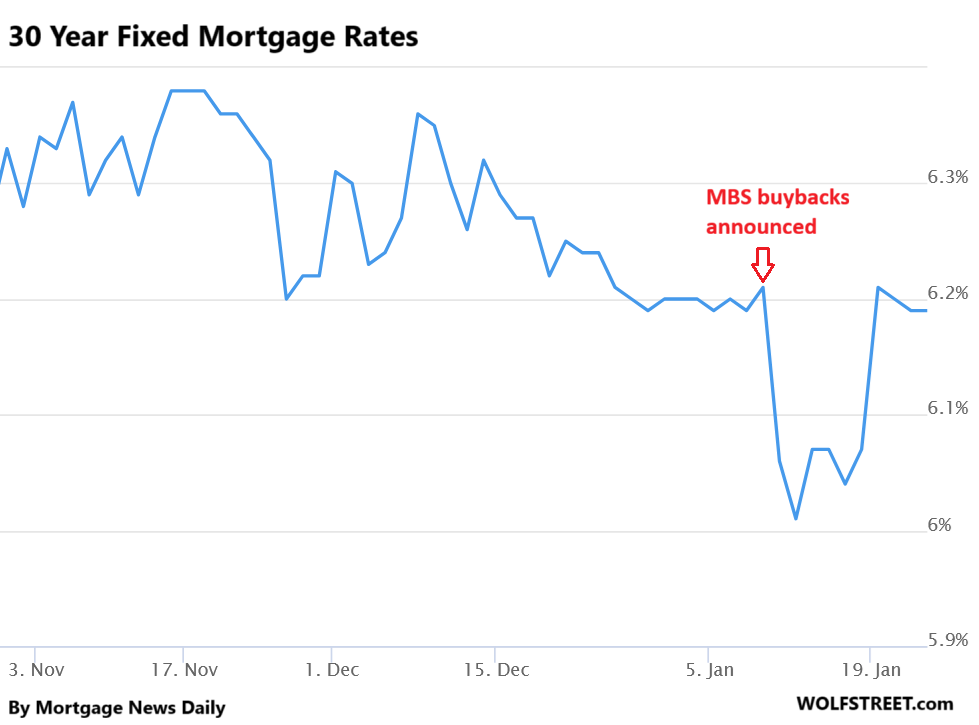 This announcement was a masterful if temporary stroke of jawboning down mortgage rates, which plunged by 20 basis points combined on Friday January 9 and Monday January 12.
