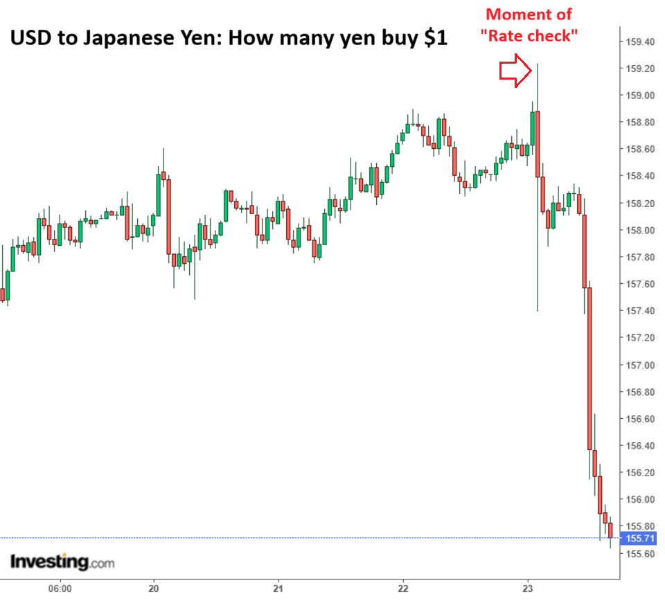 As soon as this happened around midday Friday, the USD began to plunge against the yen, and the yen jumped from 159.2 yen to the USD to 155.7 by Friday evening (hourly chart via Investing.com):
