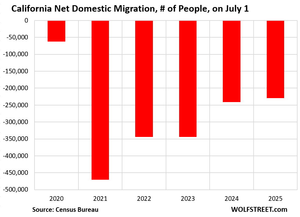 Net Domestic Migration in the period through July 1, 2025, was the least negative since the lockdown: 229,100 more people left California to other states than arrived from other states.