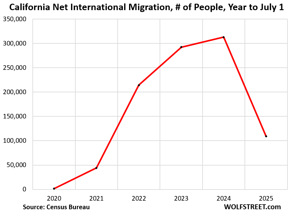 Net International Migration plunged by two-thirds under Trump’s immigration policies. In the 12 months through July 1, 2025, NIM was only 109,300 people, meaning that 109,300 more people immigrated from other countries to California than emigrated from California to other countries.