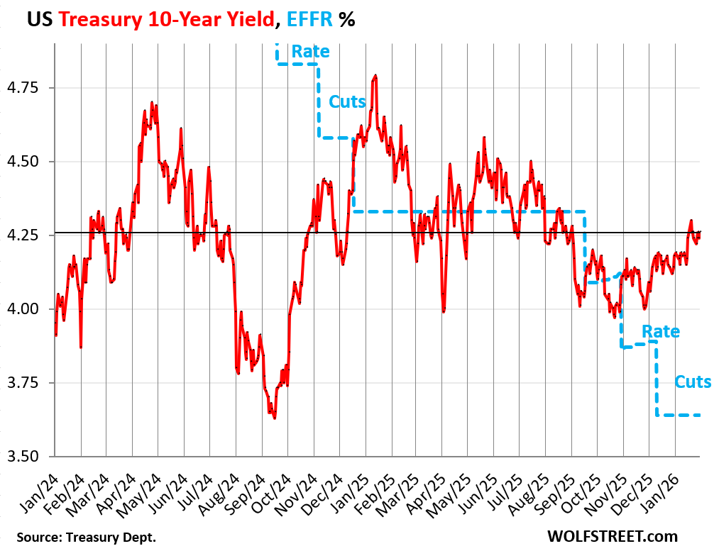 The 10-year Treasury yield was unchanged on Friday, at 4.26%, despite the utter chaos in the silver and gold market, upon the news that Trump had nominated Kevin Warsh for chair of the Federal Reserve.