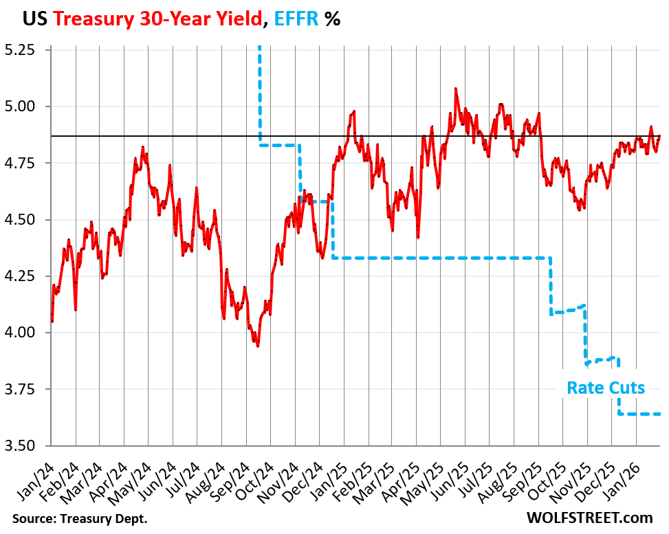 Since this rate-cut cycle began in September 2024, the Fed has cut its policy rates by 150 basis points. Over the same period, the 30-year yield has risen by nearly 100 basis points.