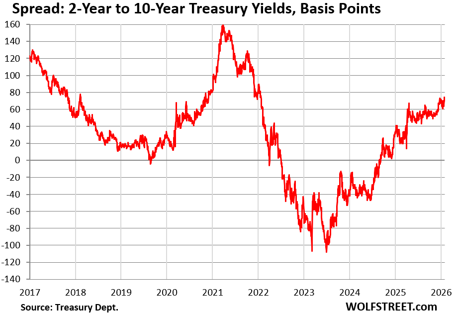 The spread between the 2-year and 10-year Treasury yields now the widest since January 2022.