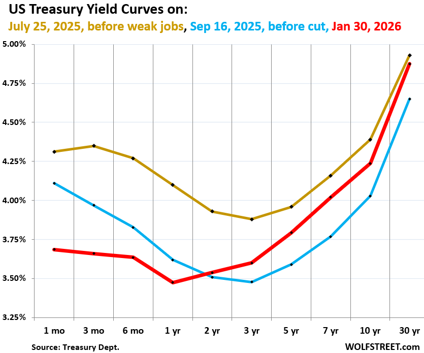 Every yield from 2 years on up has risen since the September 2025 rate cut.