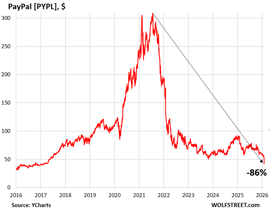 Shares of PayPal plunged 20% on Tuesday, to $41.70, after it reported earnings that missed expectations on a variety of metrics, offered Q1 guidance that disappointed, and did a CEO switcheroo out of the blue: It booted out CEO Alex Chriss “effective as of February 2, 2026,” the company announced in the SEC filing on February 3; and it hired a new CEO, HP CEO Enrique Lores, effective March 1. Criss “will remain an employee of the Company in a non-officer capacity through March 2, 2026 to assist with transition matters,” it said. And CFO Jamie Miller would serve as interim CEO until March 1. All this is kind of spooky. But PayPal has been a spooky stock for a while.