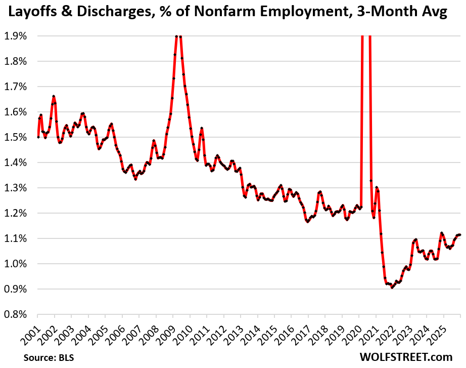 Layoffs & discharges amounted to just 1.1% of nonfarm payrolls, which would have been a record low before the pandemic in the JOLTS data, which goes back to 2001. It’s only during the labor shortages that the percentage was lower.