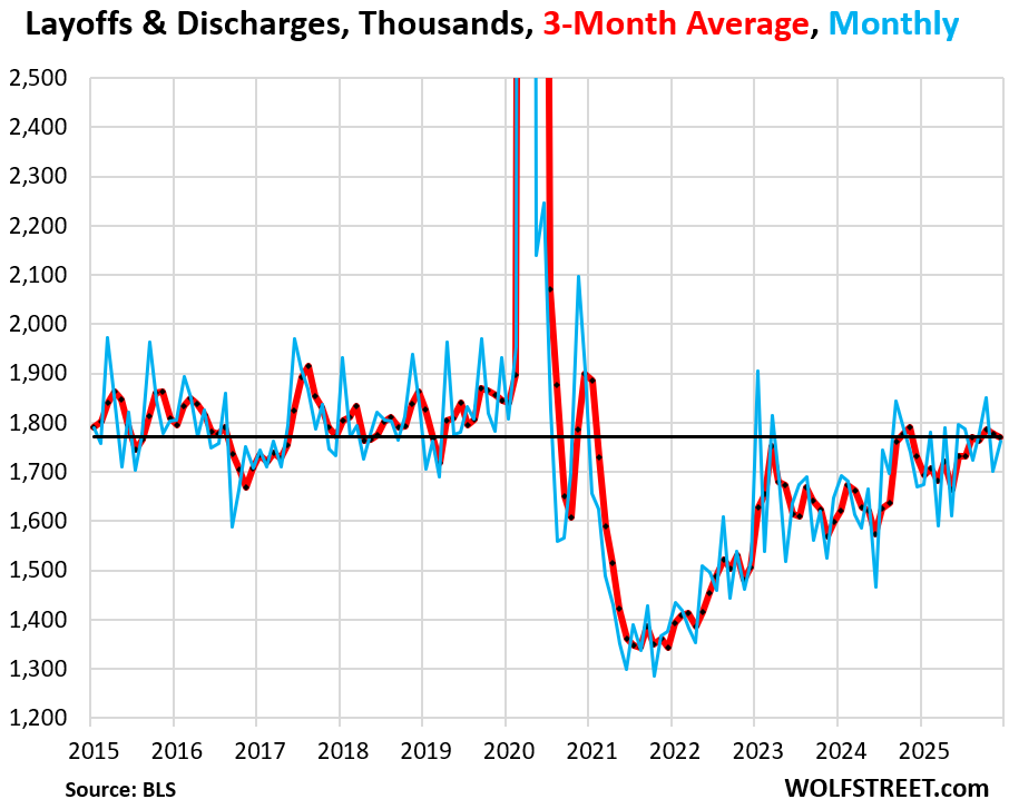 Layoffs & discharges rose by 61,000 in December, to 1.76 million, after the drop of 149,000 in November. Getting fired for a variety of reasons, or for no reason, is a classic feature of the American labor market.