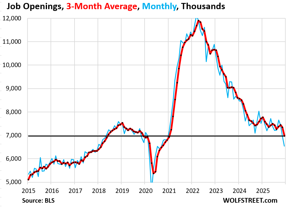 Job openings fell by 386,000 in December to 6.54 million, seasonally adjusted, according to the Bureau of Labor Statistics today. The three-month average, which irons out the month-to-month squiggles, fell by 372,000 to 6.97 million openings and has now fallen visibly below the highs in 2018 and 2019, after hovering near these pre-pandemic highs for over a year (red in the chart).