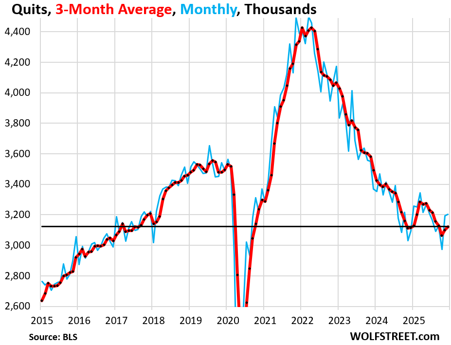 Quits – number of workers who quit their jobs voluntarily, such as to take a better job somewhere else, but does not include retirements, deaths, etc., which are tracked separately – rose by 11,000 in December, after the 220,000 jump in November, to 3.20 million (blue in the chart below).