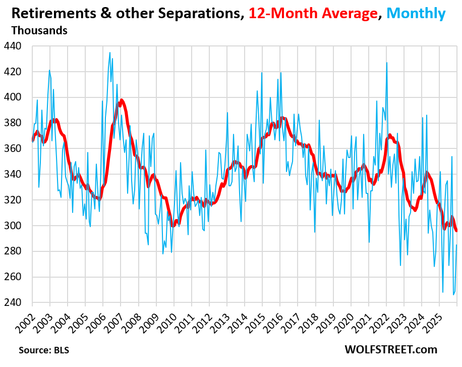 Retirements and other separations (including deaths while employed, etc.) totaled 285,000 in December, at the very low end of the 25-year range.