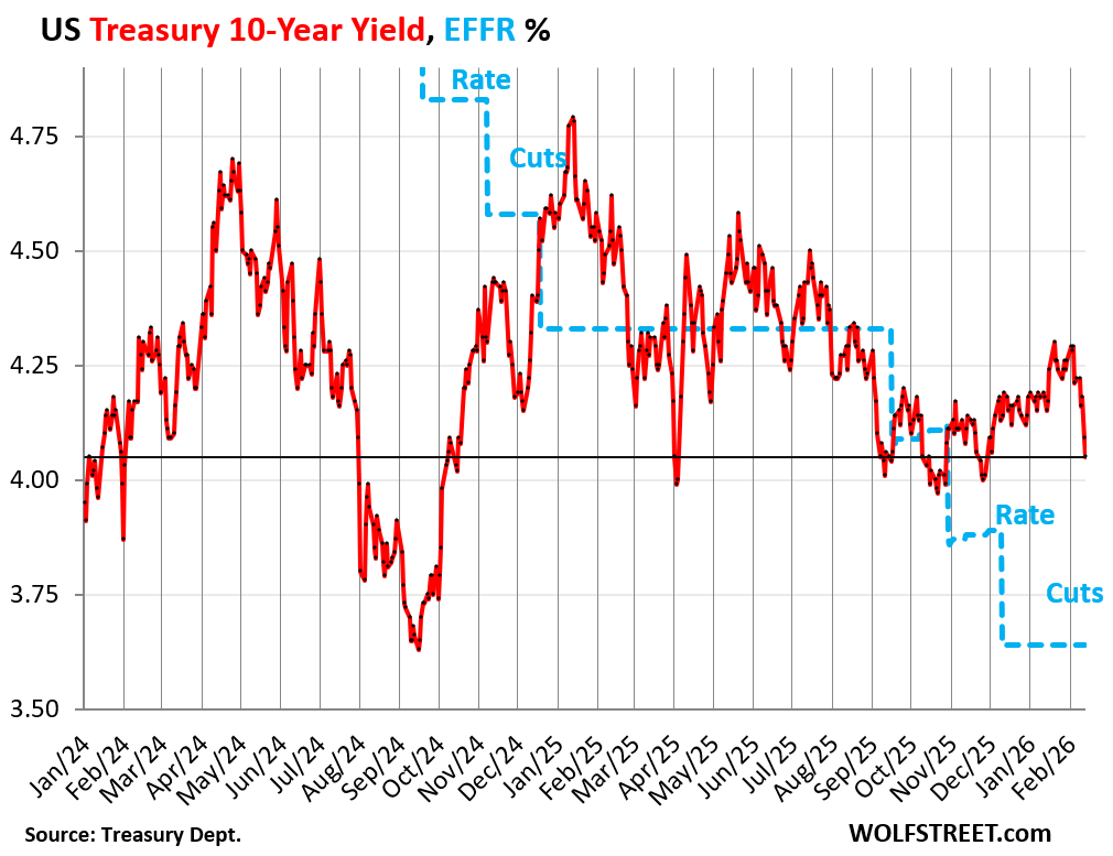 But in the two days since the auction, the 10-year yield dropped by 13 basis points in the secondary market, to close at 4.05% on Friday, the lowest since late November. Since the beginning of February, it has dropped by 24 basis points.