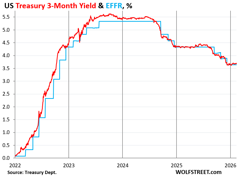 In the secondary market, the three-month yield, at 3.68% on Friday at the close, was up just a hair from a month ago (3.67%) and was higher than the Effective Federal Funds Rate (EFFR) which the Fed targets with its policy rates (blue line):