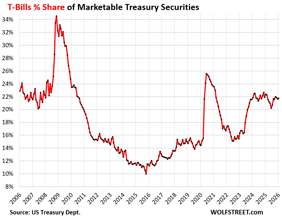 The ratio of T-bills outstanding to total Treasuries held by the public has remained roughly unchanged for the past four months, and at the end of January was 21.7%, up a hair from December, but down a hair from October and November, and lower than in 2024.