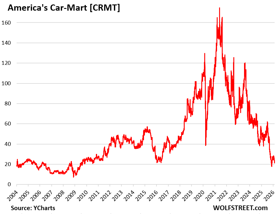 Publicly traded subprime dealer-lender chain America’s Car-Mart [CRMT] got hit, and we featured it here in December 2023 when it began confessing to its issues. At the time, the stock had tanked by 61% from its high in May 2021.