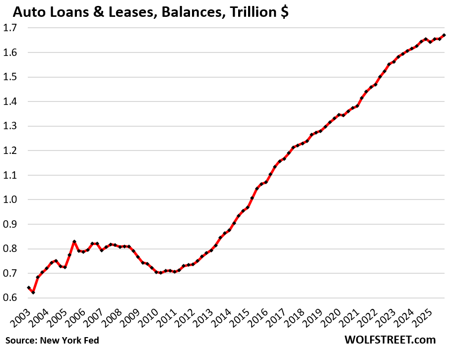 Total balances of auto loans and leases for new and used vehicles inched up by $15 billion year-over-year and for the quarter, to $1.67 trillion, after the dip in Q1 and the flat reading in Q3, according to the New York Fed’s report on consumer credit, based on Equifax data.