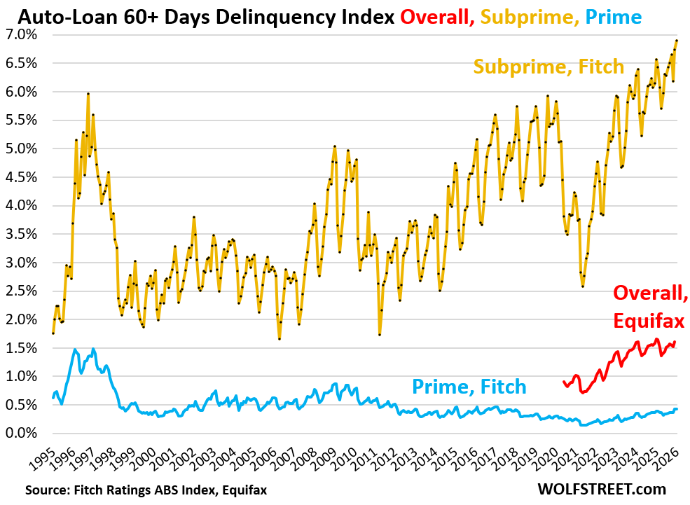 But “prime” auto loans are nearly always in pristine condition. The 60-plus-day delinquency rate of prime auto loans that were packaged into prime ABS tracked by Fitch remained at 0.4% in January, same as in December 2025, and same as in January 2018. Even during the Great Recession, the prime delinquency rate maxed out at only 0.9%. There was a bigger problem in the mid-1990s, when securitizing auto loans became a big thing and the nascent industry was climbing up a learning curve (blue in the chart).