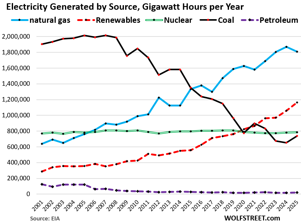 Natural gas dipped but still ruled. Electricity generated by natural-gas-fired power plants declined by 3.3% to 1,807,338 GWh in 2025, the second-highest after the record in the prior year (blue in the chart below).