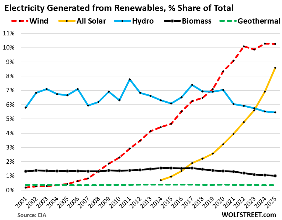 The share of all renewables combined increased to a record 25.7% of total power generation (red). More on them in a moment.