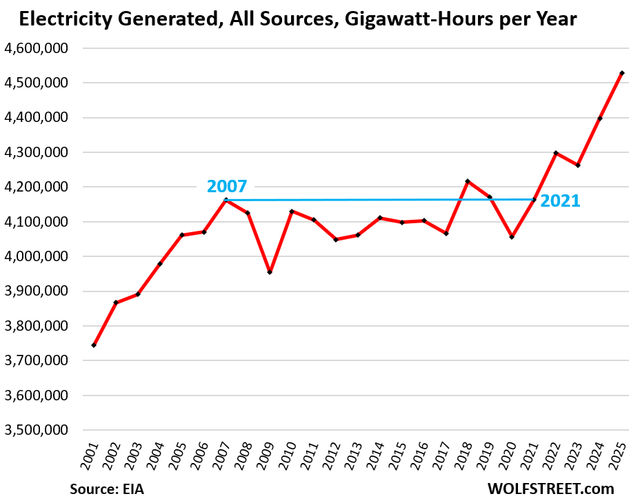 There had been 14 years of roughly no growth in power generation from 2007 through 2021, despite the growing economy and population, as electricity users cut their usage by investing in more efficient equipment – lights, appliances, electronic equipment, industrial equipment, heating and air-conditioning, etc. – and by investing in building insulation, shading, etc., with the hope of putting a lid on their rising power costs. During those years, many power generators and electric utilities were mired in a no-growth business where only rate increases could generate revenue growth.