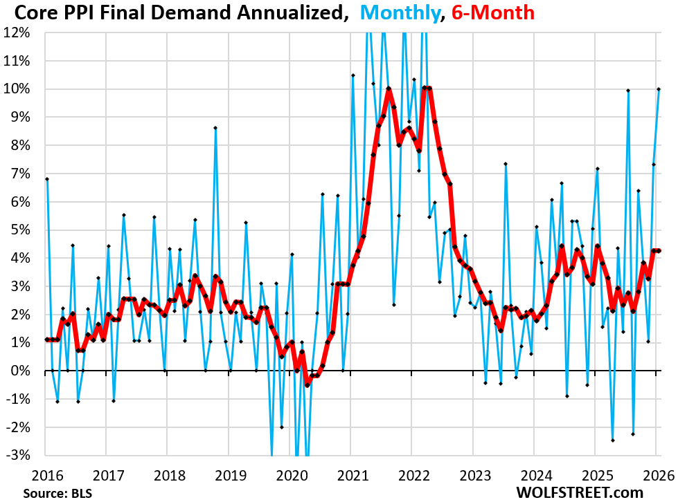The PPI for Final Demand Services spiked by 0.81% (+10.2% annualized) in January from December after the 0.67% spike in December, seasonally adjusted, according to data from the Bureau of Labor Statistics today (blue in the chart). The 6-month average rose by 4.1% annualized, a hair less than in December, which had been the worst since February 2025 (red).