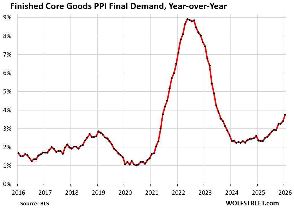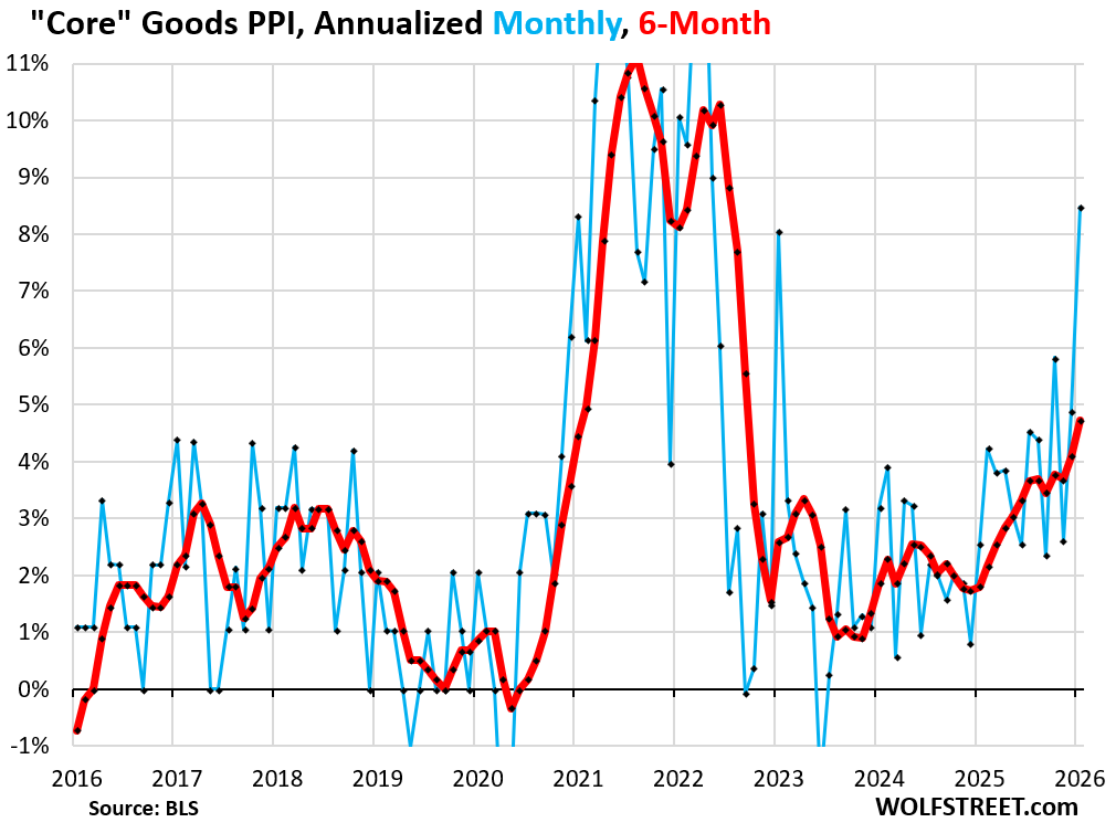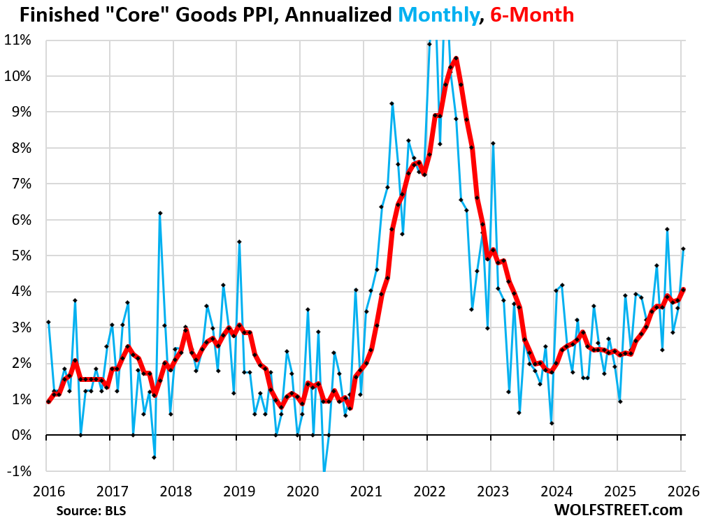 The Producer Price Index (PPI) for services spiked by 0.81% (+10.2% annualized) in January from December, seasonally adjusted, the second spike in a row. The PPI for “core” goods, which excludes food and energy products, spiked by 0.68% (+8.5%), the most since 2022. PPI does not track import prices and tariffs; it tracks prices that companies charge each other. So it tracks how companies are shuffling the costs of the tariffs around amongst each other. But the PPI for finished core goods rose by a more modest but still high 0.42% (+5.2% annualized), suggesting that there is resistance to price increases among consumer-facing companies as they’ve had a hard time passing on price increases to consumers without losing sales.