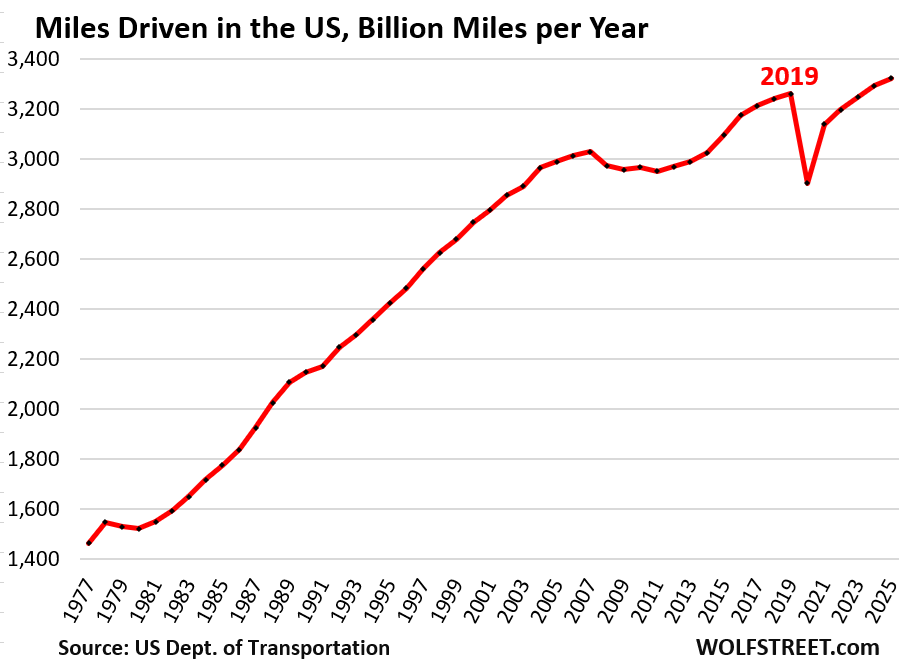 Miles driven edged up 0.9% in 2025, to a record of 3,324 billion miles, according to data from the Department of Transportation (includes miles driven by cars, light trucks, buses, motorcycles, delivery vans, and commercial trucks). But that’s only 9.7% higher than at the prior peak in 2007.