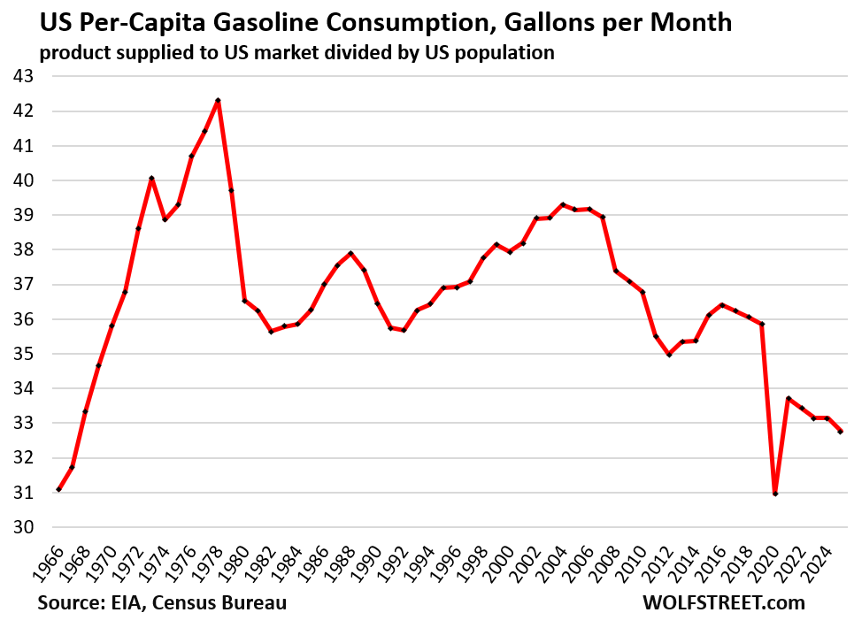 Per-capita gasoline consumption fell to 32.8 gallons per month in 2025, the lowest since 1967, except for the Covid year 2020, as a result of declining overall gasoline consumption amid a growing population.