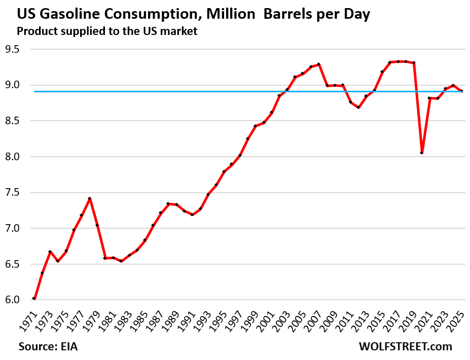 Gasoline consumption in the US, in terms of product supplied to gas stations, declined by about 1% in 2025, to 8.91 million barrels per day, according to EIA data, below where consumption had first been in 2003, even though the US population increased by 52 million people, or by 18%, over the same period.