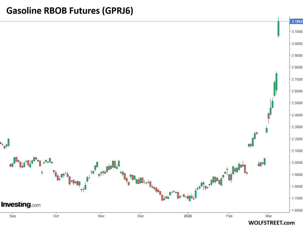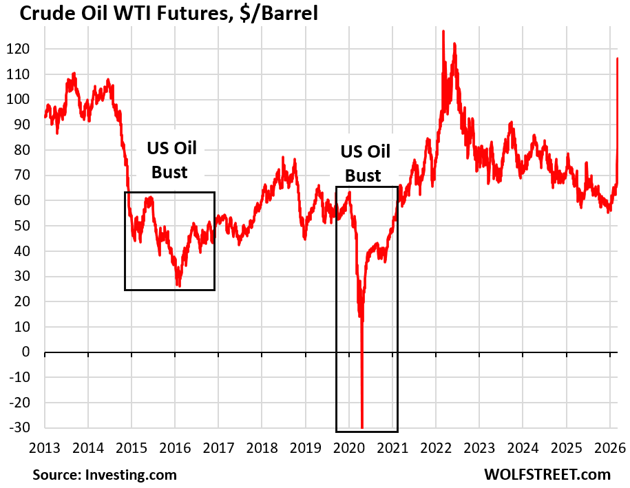 Oil prices spiked further over the weekend. Sunday night, futures of WTI spiked by 28% to $116 per barrel at the moment, amid huge volatility up and down, as traffic through the Strait of Hormuz essentially stopped, and speculation in the futures market went haywire. Since the beginning of March, the price of WTI futures has nearly doubled. This is the same market where the price of WTI futures dropped to an absurd negative -$37.63 per barrel in April 2020. Things can get a little crazy in the futures market.