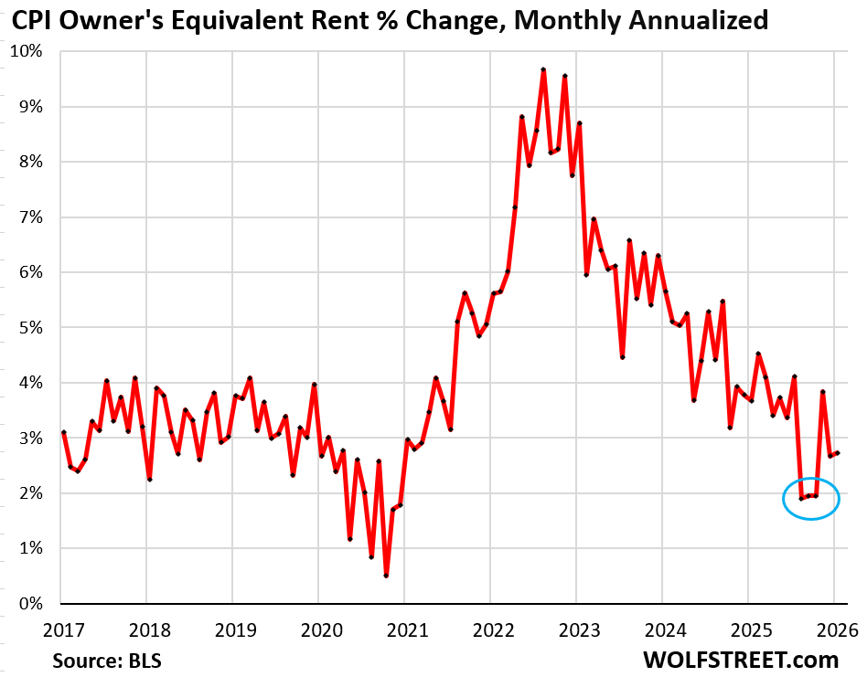 The immediate issue with OER is September, October, and November. In September, the month-to-month increase of OER did a suspicious outlier-plunge, and with no data for October due to the government shutdown and apparently no data for November either, the September outlier was carried forward through November. Since then, the month-to-month increases seem normal, given what OER represents.