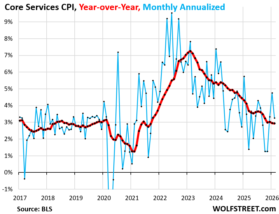 The energy CPI jumped by 0.63% in February from January (+7.9% annualized). Gasoline prices jumped in February from January, even on a seasonally adjusted basis. The price of utility natural gas piped to the home spiked, as did prices of other fuels used at home, largely propane, heating oil, and firewood, amid a harsh winter in parts of the country. Electricity prices backed off for the second month from the spike that had topped in December.