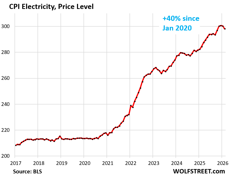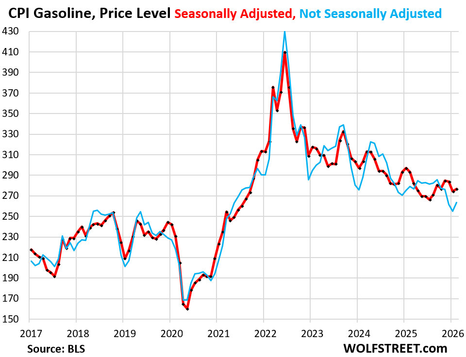 What kept overall energy costs from blowing out for American households over the past couple of years was the long decline of gasoline prices from the top of the spike that ended in mid-2022. But electricity prices have shot up, and utility natural gas has shot up. And now in March, gasoline prices have started to shoot up too amid soaring oil prices.