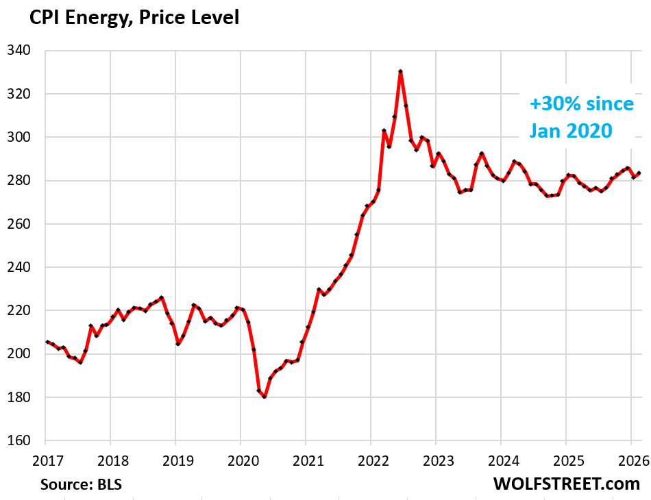 Energy costs combined. The energy CPI, which tracks the above categories, rose by 0.6% in February from January. Year-over-year it was up just a hair, pushed down by the decline in gasoline prices through February. Gasoline accounts for about half of the energy CPI. And the increase of the energy CPI in March will be a sight to behold.
