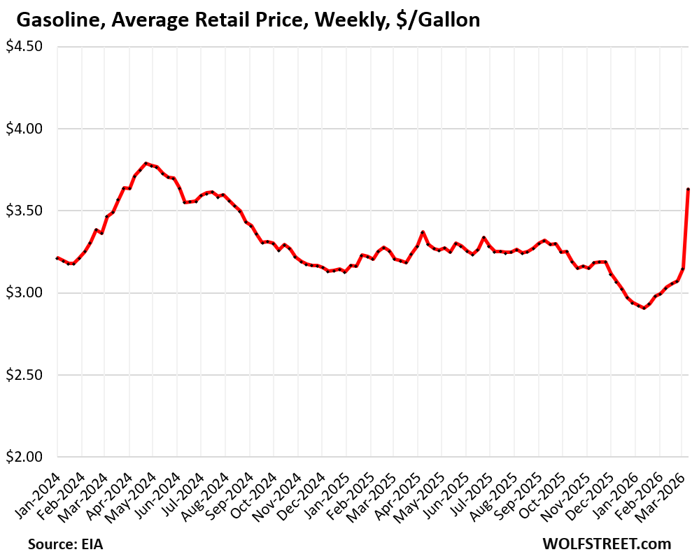 The average retail price of gasoline, all grades combined, at gas stations in the week through March 9 spiked by $0.49 from the prior week, and by $0.73 from early January, to $3.63 a gallon, the highest since June 2024, according to EIA data. Compared to a year ago, gasoline is now up by nearly 14%, having flipped from many months in a row of year-over-year declines.