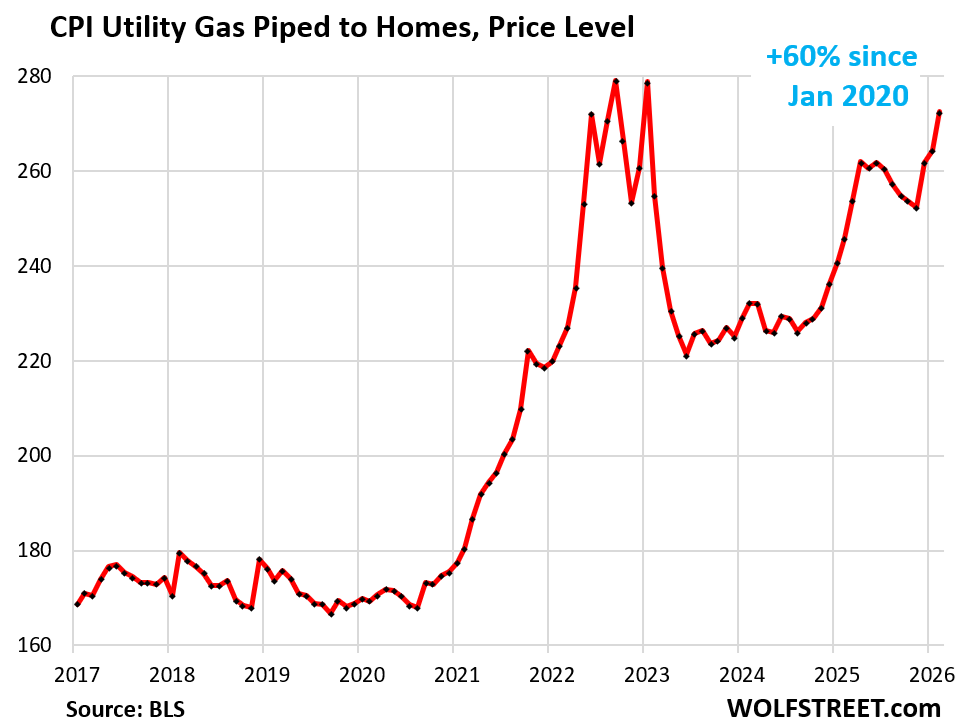 Utility natural gas: The CPI for utility natural gas piped to the home spiked by 3.1% in February from January and by 10.9% year-over-year. Since January 2020, it has surged by 60%.